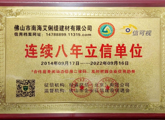 广东省重点商标—艾俐缇陶瓷凭借多年的诚信经营,得到社会各界的肯定,连续八年获得“立信单位”荣誉称号!